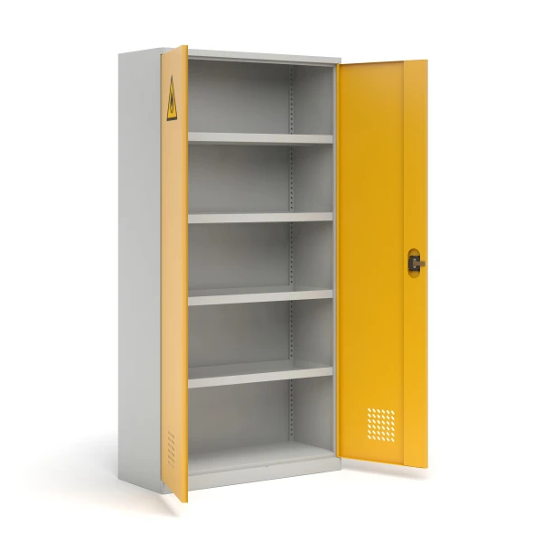- 4 adjustable full zinc plated shelves with edges on all sides, preventing hazardous substances from spilling outside the cabinet.
