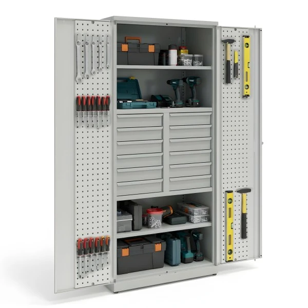Tool cabinet with 2 adjustable shelves, 12 drawers 100 mm high and perforated panels on the doors