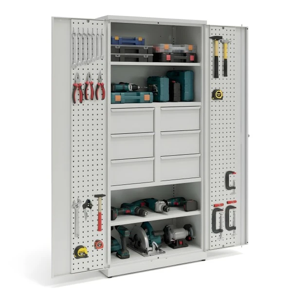 Tool cabinet with 2 adjustable shelves, 6 drawers 200 mm high and perforated panels on the doors
