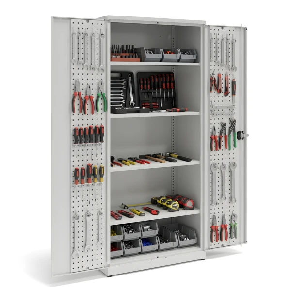 - workshop cabinet of solid structure with full double hinged doors, with perforated panels,