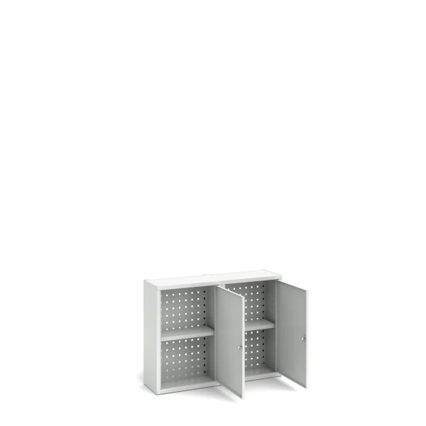 • wall-mounted 2-compartment workshop cupboard with hinged doors is locked with a key lock,