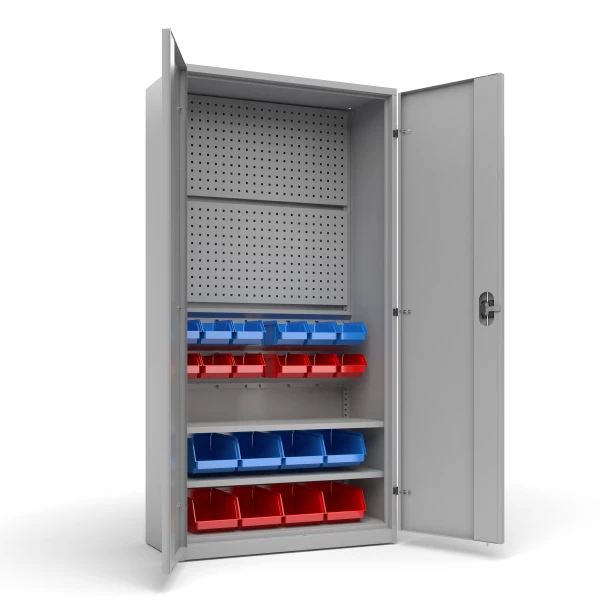 Workshop cabinet with 2 panels, 2 adjustable shelves and 20 containers