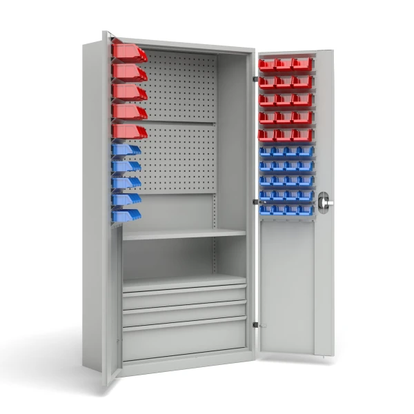 Workshop cabinet with 2 panels, 2 shelves, 3 drawers and 70 containers
