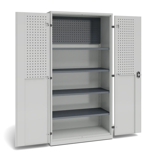 Workshop cabinet with full hinged doors, perforated panel, 4 adjustable shelves, perforated panels on the doors