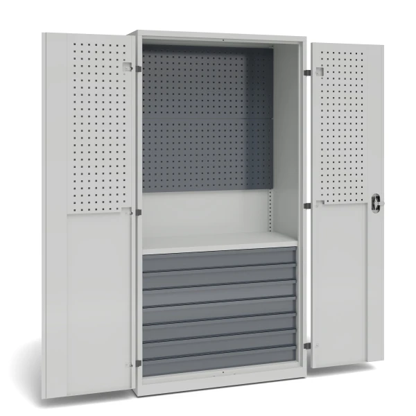 Szafa warsztatowa z 2 panelami perforowanymi, 1 półką stałą, 7 szufladami o wys. 100 mm, panelami perforowanymi na drzwiach